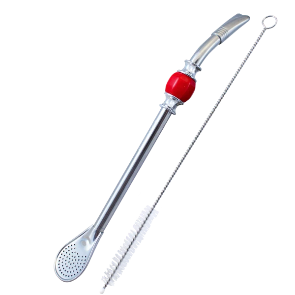 - Bombilla Grande z czerwonym kamieniem chłodzącym wykonana ze stali nierdzewnej. Posiada uniwersalny filtr typu łyżeczkowego. Doskonale radzi sobie z większością rodzajów yerba mate i innych naparów.