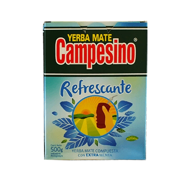 - Yerba Mate Campesino Refrescante 500 g 0.5 kg to paragwajska yerba mate z liśćmi mięty oraz olejkiem miętowym. Świetnie pobudza i orzeźwia.